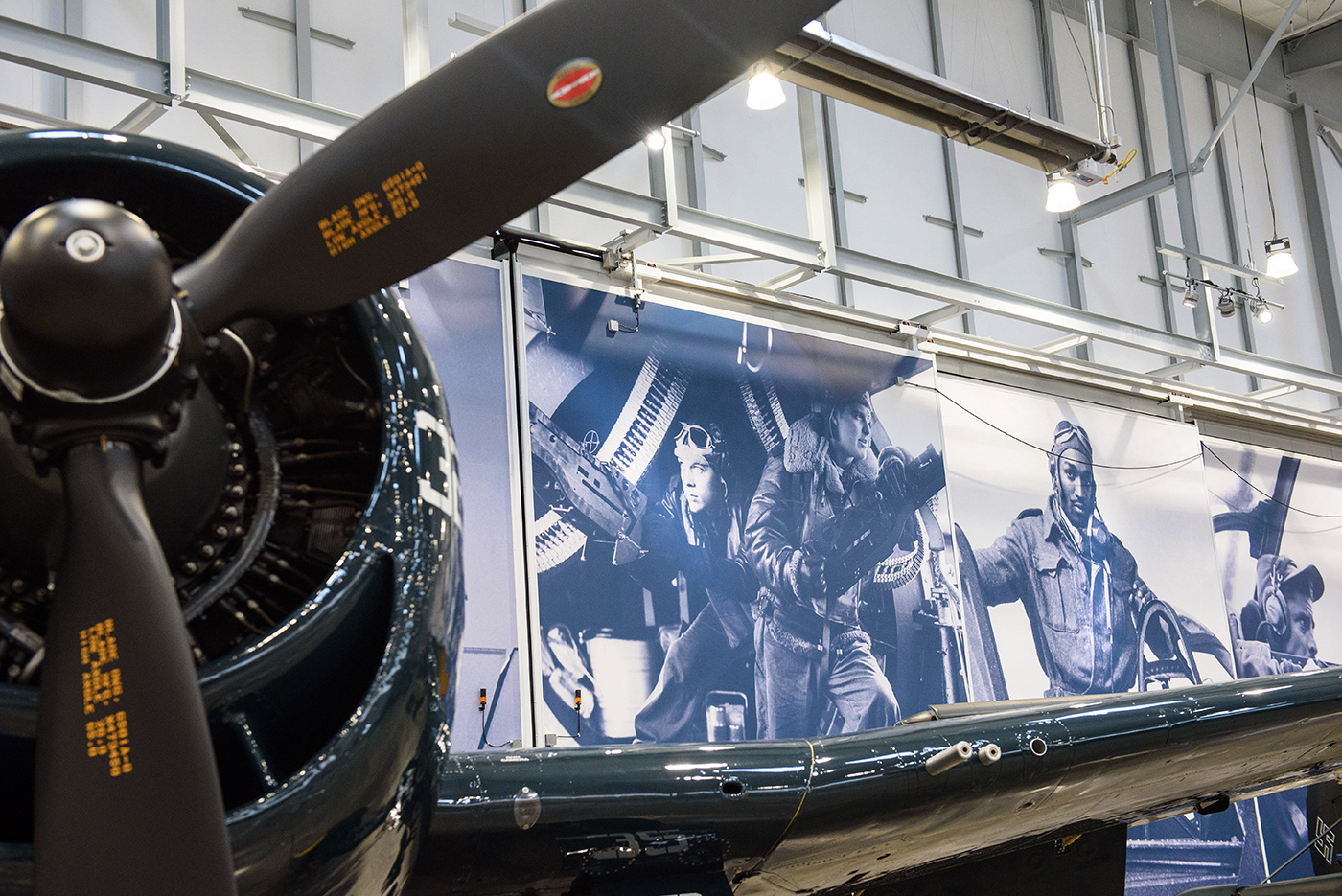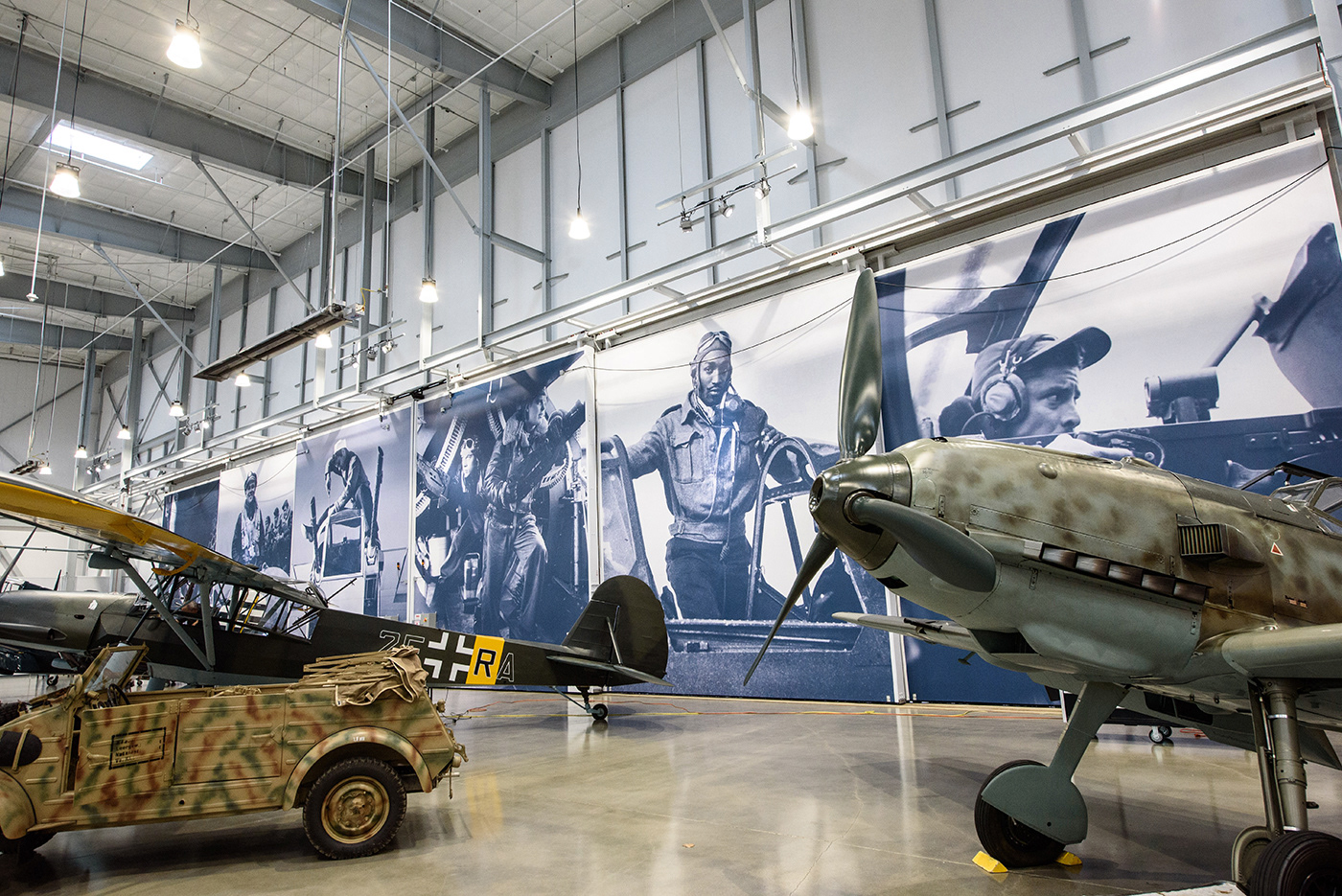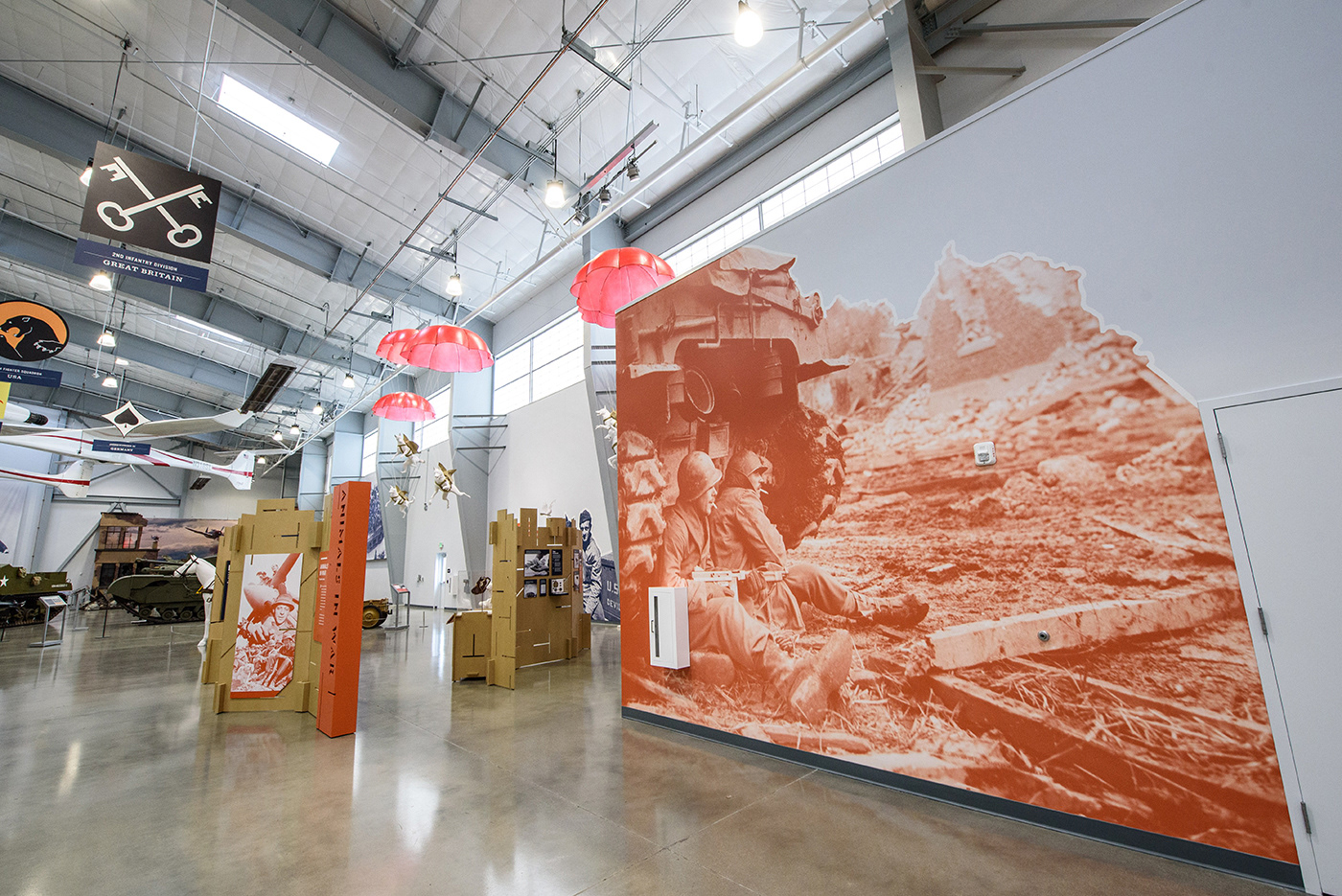 In Fall of 2018, the Flying Heritage & Combat Armor Museum (FHCAM) in Everett, WA expanded its museum with a new, 32,000 sq. ft. hangar containing artifacts and exhibits. As part of the development of the space, FHCAM hired Curious Beast to develop a series of environmental graphics to help bring the hangar to life. FHCAM sought to bring more of a human presence into it's collection of WWII aircraft and tanks, so, after delving into a deep repository of imagery from the War, I utilized images of soldiers, Marines, pilots, and workers to create monumental backdrops for the iconic artifacts.